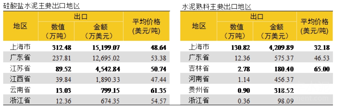 3、水泥出口地集中在上海、廣東和江蘇地區