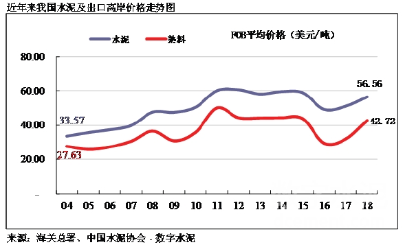 自2006年水泥出口達到高峰的3,612萬(wàn)噸以后,我國水泥出口量呈明顯逐年下降趨勢,主要原因:一是我國出口政策的調整,2007年國家取消了11%出口退稅的優(yōu)惠政策。二是國際市場(chǎng)需求疲軟,水泥需求缺口縮小,尤其是原來(lái)我國出口大戶(hù)美國房地產(chǎn)業(yè)投資大幅下滑,導致其進(jìn)口水泥大幅度縮減。2018年出口量?jì)H為904萬(wàn)噸,這是自2005年以來(lái)首次跌破1000萬(wàn)噸,但出口的FOB價(jià)格連續三年回升,2018年達到56.6美金。