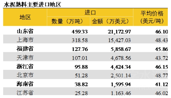 從進(jìn)口熟料的區域來(lái)看,山東占總進(jìn)口量的36%,位于長(cháng)三角區域的上海、浙江、江蘇合計占35%,華南福建、海南兩省合計占13%。